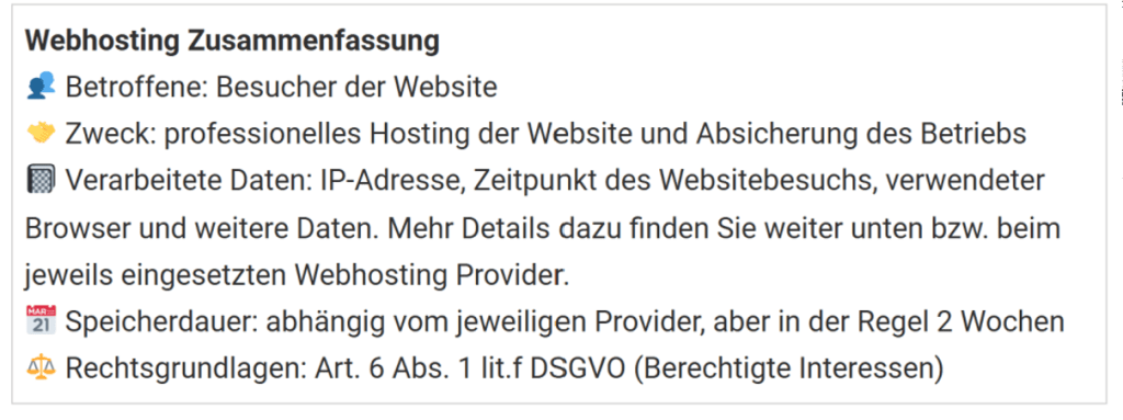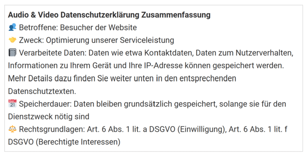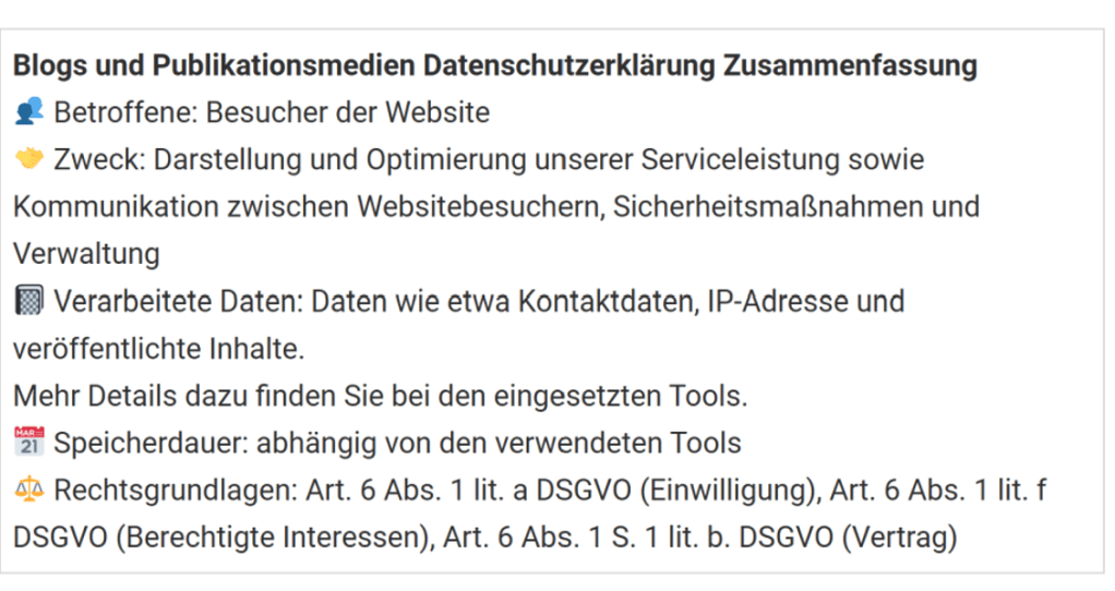 Weitere Bedingungen wie die Wahrnehmung von Aufnahmen im öffentlichen Interesse und Ausübung öffentlicher Gewalt sowie dem Schutz lebenswichtiger Interessen treten bei uns in der Regel nicht auf. Soweit eine solche Rechtsgrundlage doch einschlägig sein sollte, wird diese an der entsprechenden Stelle ausgewiesen.
