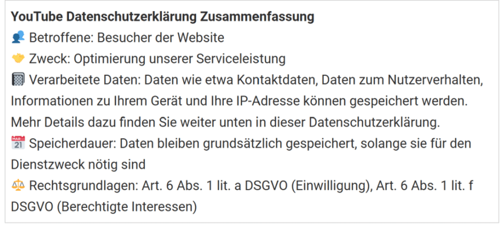 YouTube verarbeitet Daten u.a. auch in den USA. Wir weisen darauf hin, dass nach Meinung des Europäischen Gerichtshofs derzeit kein angemessenes Schutzniveau für den Datentransfer in die USA besteht. Dies kann mit verschiedenen Risiken für die Rechtmäßigkeit und Sicherheit der Datenverarbeitung einhergehen.