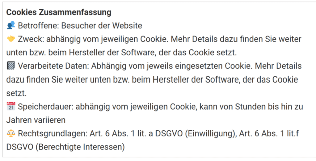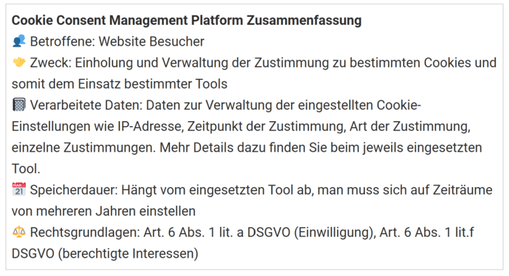 Erläuterung: In der Regel erfolgt bei Websites eine solche Einwilligung über ein Cookie-Consent-Tool. Sie kennen das bestimmt. Immer wenn Sie erstmals eine Website besuchen, werden Sie meist über einen Banner gefragt, ob Sie der Datenverarbeitung zustimmen bzw. einwilligen. Meist können Sie auch individuelle Einstellungen treffen und so selbst entscheiden, welche Datenverarbeitung Sie erlauben und welche nicht. Wenn Sie nicht einwilligen, dürfen auch keine personenbezogene Daten von Ihnen verarbeitet werden. Grundsätzlich kann eine Einwilligung natürlich auch schriftlich, also nicht über ein Tool, erfolgen.