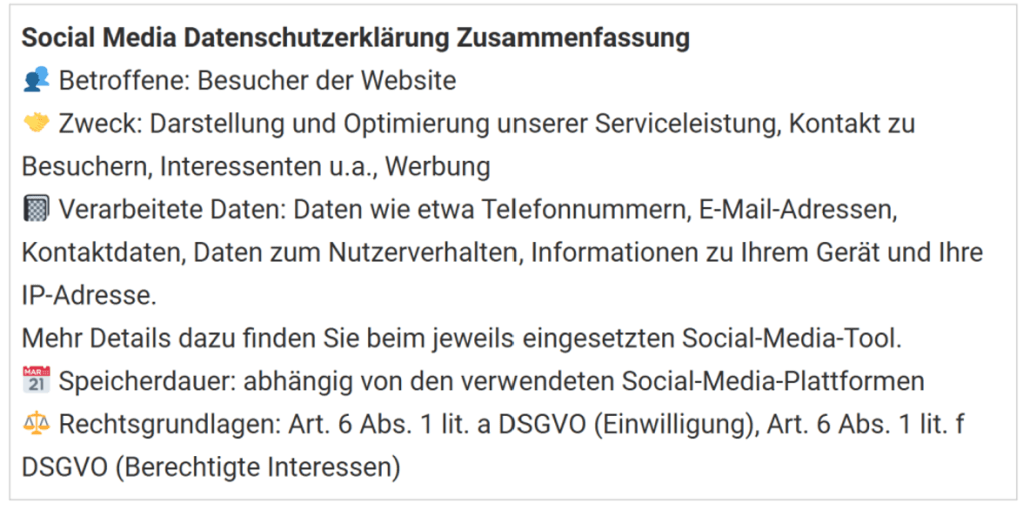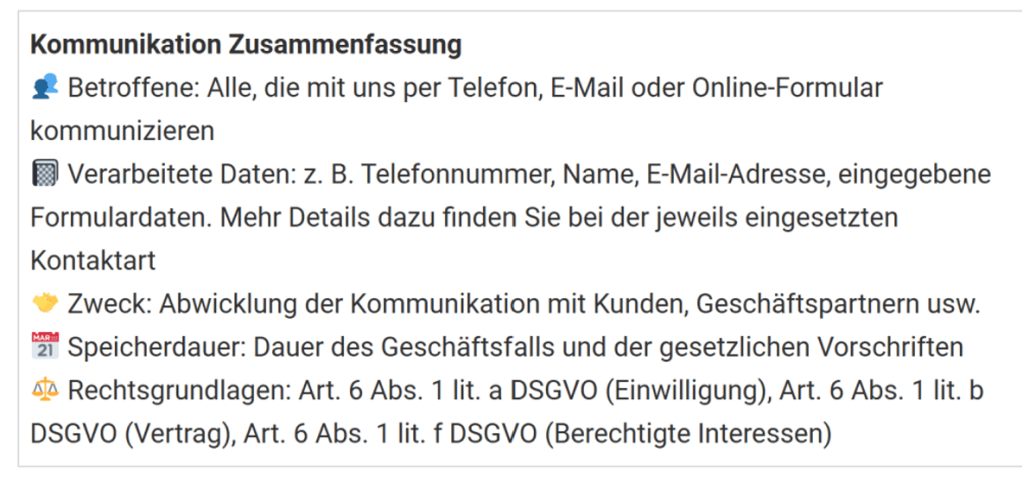 Kurz gesagt: Die Datenschutzerklärung gilt für alle Bereiche, in denen personenbezogene Daten im Unternehmen über die genannten Kanäle strukturiert verarbeitet werden. Sollten wir außerhalb dieser Kanäle mit Ihnen in Rechtsbeziehungen eintreten, werden wir Sie gegebenenfalls gesondert informieren.